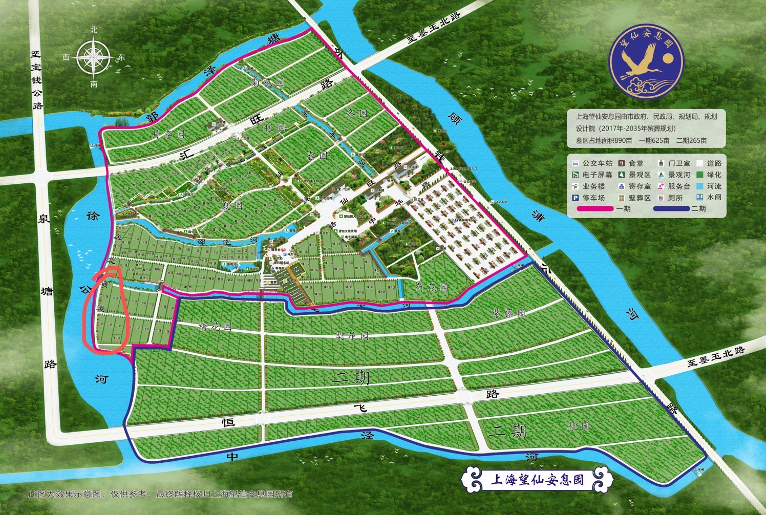 望仙安息园位于上海市嘉定区外钱公路1515号,是经民政局批准的经营性公墓,墓区占地面积890亩,一期560亩,二期330亩。由轨交11号线至嘉定北站转乘公交嘉定61路至望仙园站即可到达,交通方便。整个园区四面环水,是一块让生者慰藉、逝者安息的风水宝地。